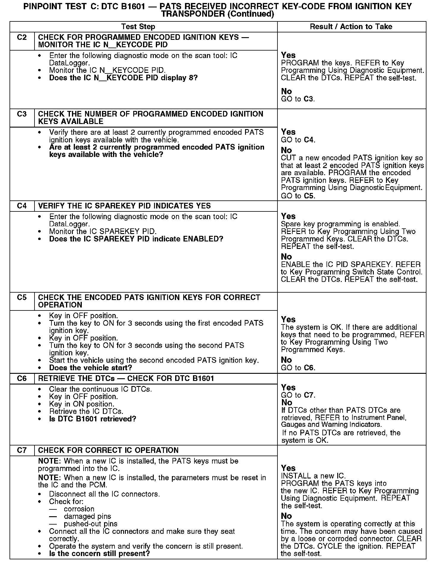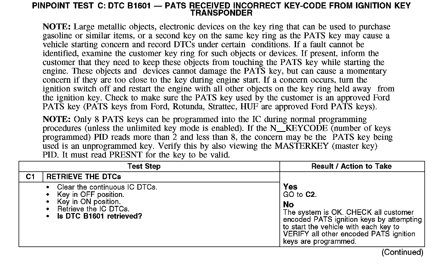 Test C: DTC B1601 - PATS Received Incorrect Key-Code From Ignition Key Transponder