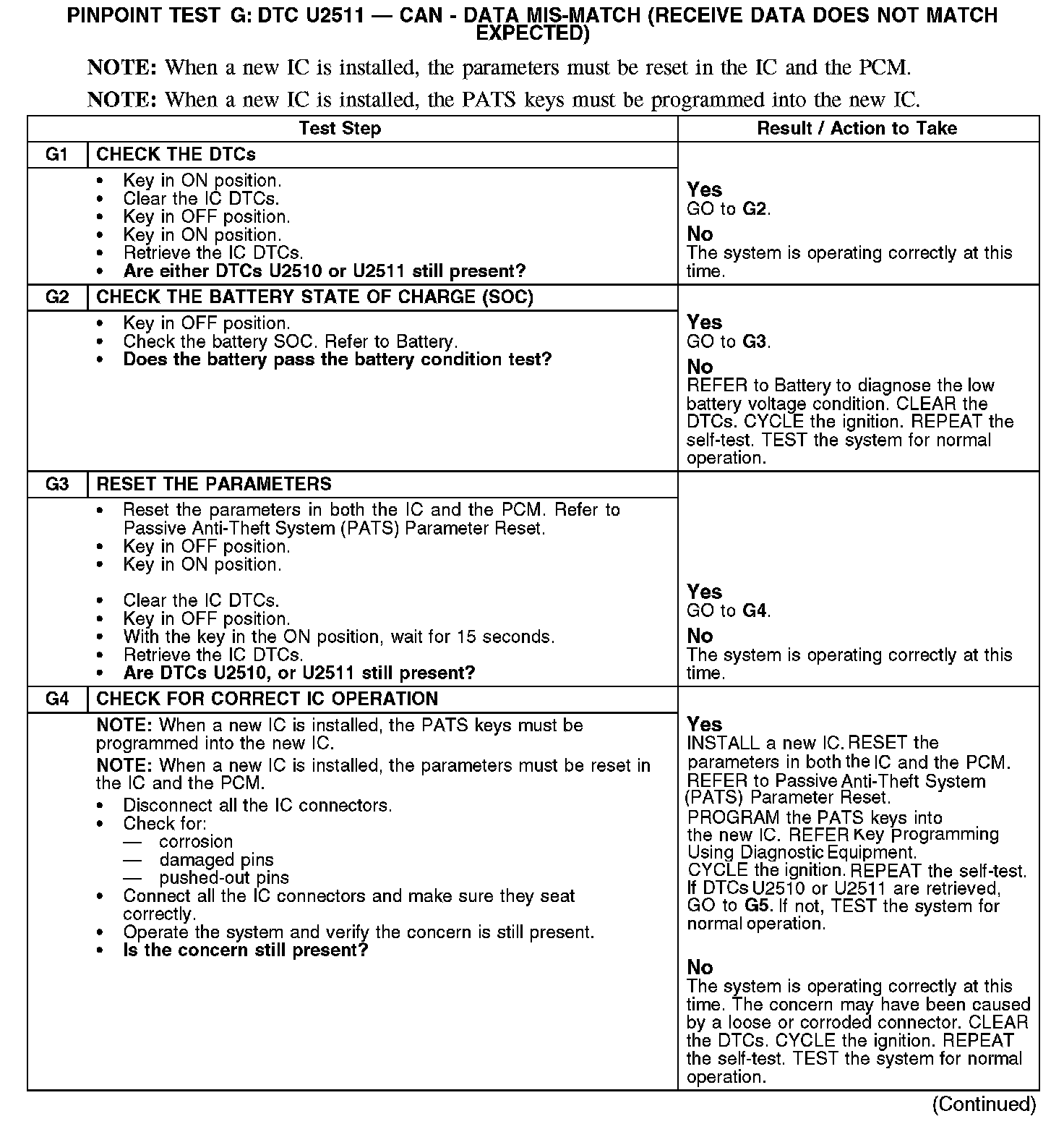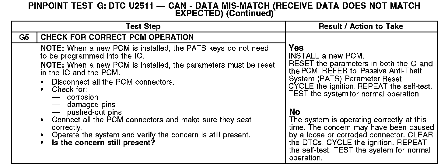PINPOINT TEST G: DTC U2511 - CAN - DATA MIS-MATCH (RECEIVE DATA DOES NOT MATCH EXPECTED)Normal Operation