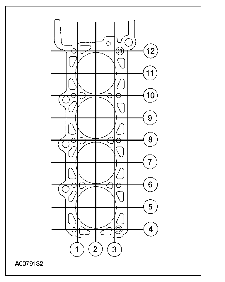 Using a straightedge and a feeler gauge, inspect the cylinder head for flatness in the sequence shown.