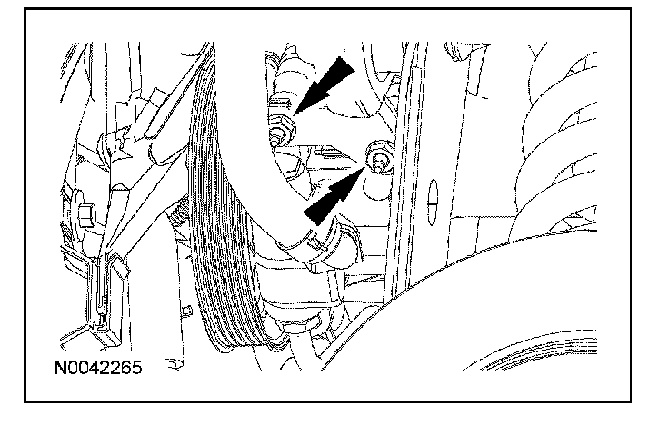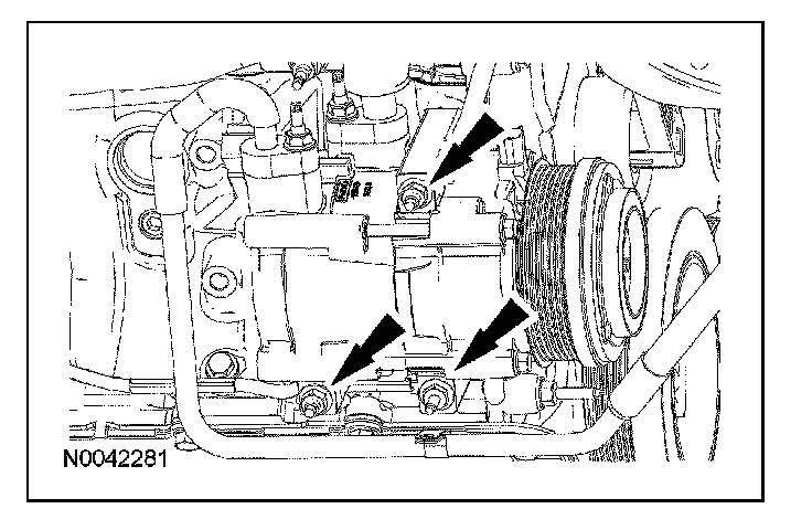 9. Position the A/C compressor and install the 2 nuts and the stud bolt.