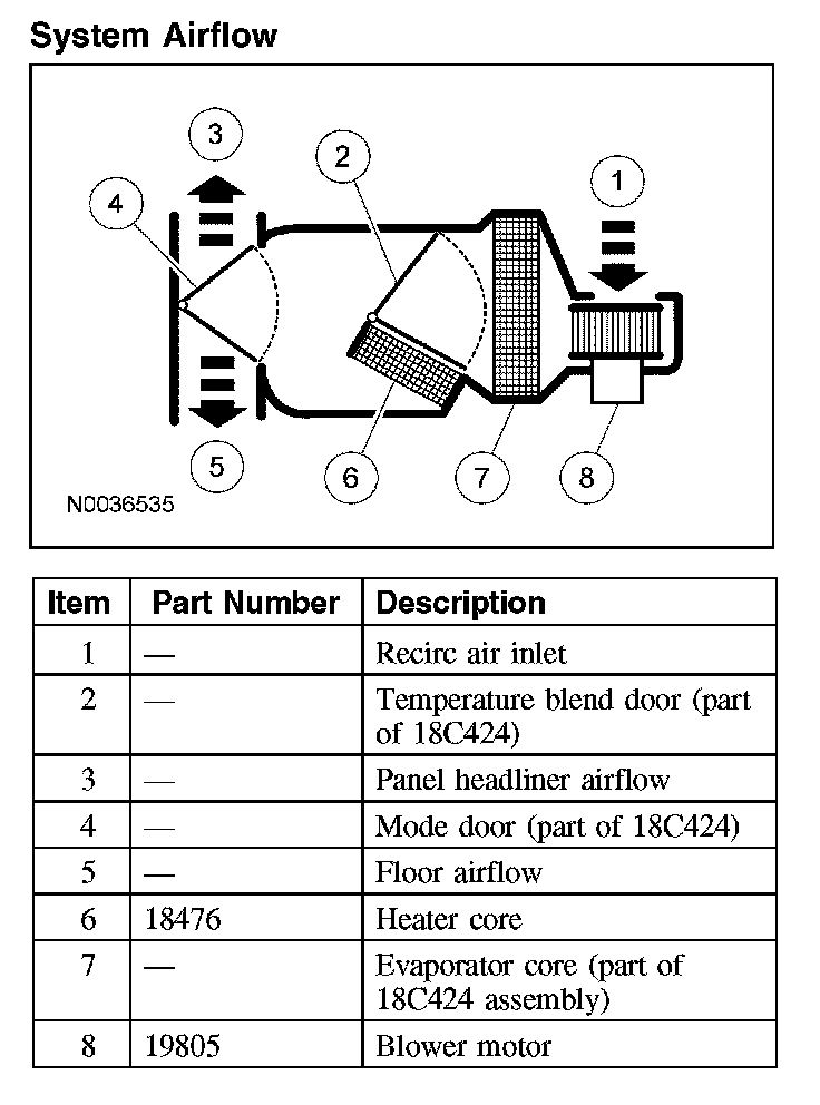 The evaporator core is an aluminum plate/fin type and is located in the auxiliary heater core and evaporator core housing. A mixture of refrigerant and oil enters the bottom of the evaporator core through the evaporator core inlet tube and then moves out of the evaporator core through the evaporator core outlet tube. When the A/C compressor is operating, air from the blower motor is cooled and dehumidified as it flows through the evaporator core fins.