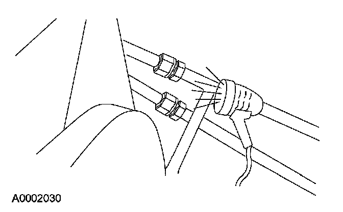 NOTE: Ford Motor Company vehicles are produced with R-134a fluorescent dye installed in the refrigerant system from the factory. The location of leaks can be pinpointed by the bright yellow-green glow of the fluorescent dye under a UV lamp. Since more than one leak can exist, make sure to inspect each component, line and fitting in the refrigerant system for a leak.