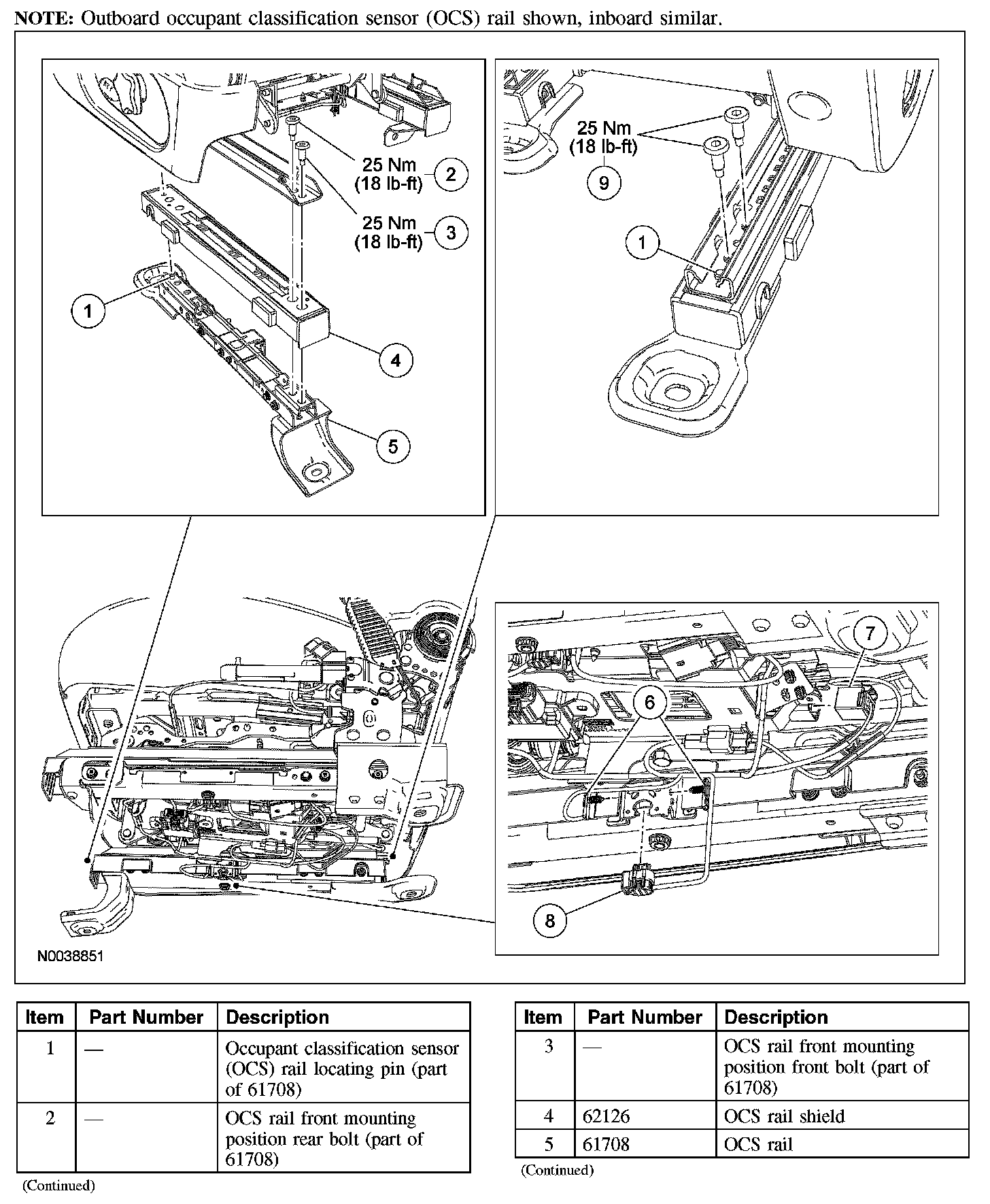 - Do not disassemble the occupant classification sensor (OCS) rail or tighten or loosen any of the nuts and bolts installed to the OCS rail body. Only the 8 bolts that attach the 2 OCS rails to the seat track may be removed and installed. Failure to follow these instructions may result in incorrect operation of the OCS system and increase the risk of serious personal injury or death in a crash.
