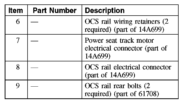 CAUTION: Prevent oil and/or grease from getting on the occupant classification sensor (OCS) rail bolts as this can lead to tightening beyond the specified torque value. Failure to follow this instruction may result in damaged or broken OCS rail bolts.