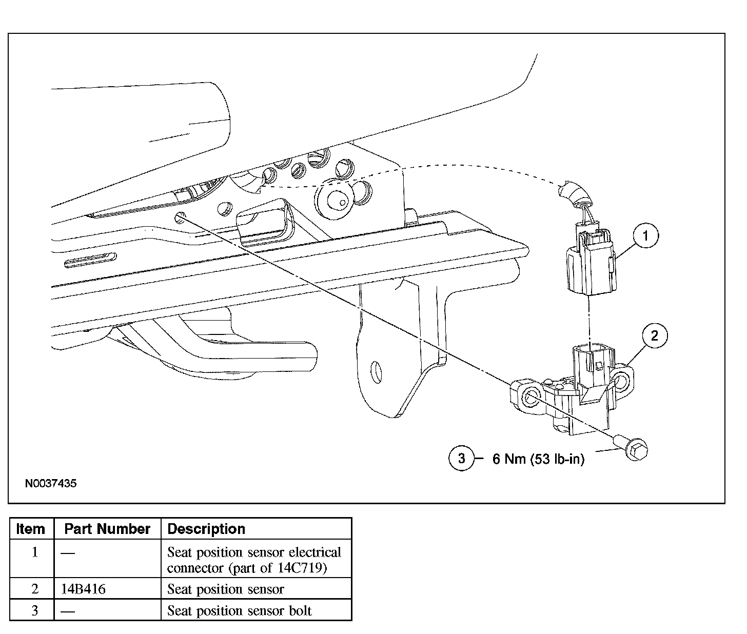 4. WARNING: Always tighten the seat position sensor retaining bolt to specified torque. Failure to do so may result in incorrect restraint system operation, which increases the risk of personal injury or death in a crash.