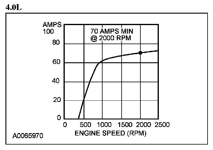 4. With the engine running at approximately 2,000 rpm, adjust the tester load bank to determine the output of the generator. The generator output should be greater than the graph shown. If not, refer to the pinpoint test or GO to Symptom Chart. Pinpoint Tests Symptom Related Diagnostic Procedures