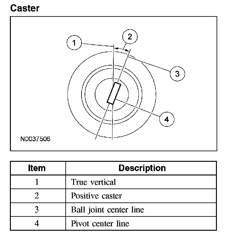 Caster is the deviation from vertical of an imaginary line drawn through the ball joints when viewed from the side. The caster specifications will give the vehicle the best directional stability characteristics when loaded and driven. The caster setting is not related to tire wear.