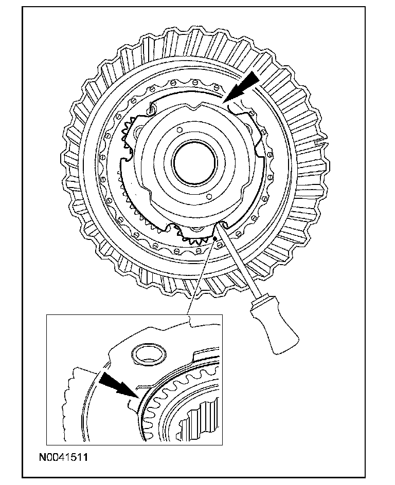 ^ With a small screwdriver or a suitable pick inserted into the sun, gear push on the retaining ring in 3 places while lifting up on the sun gear to remove.