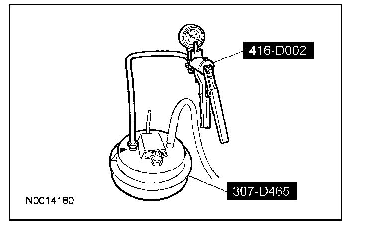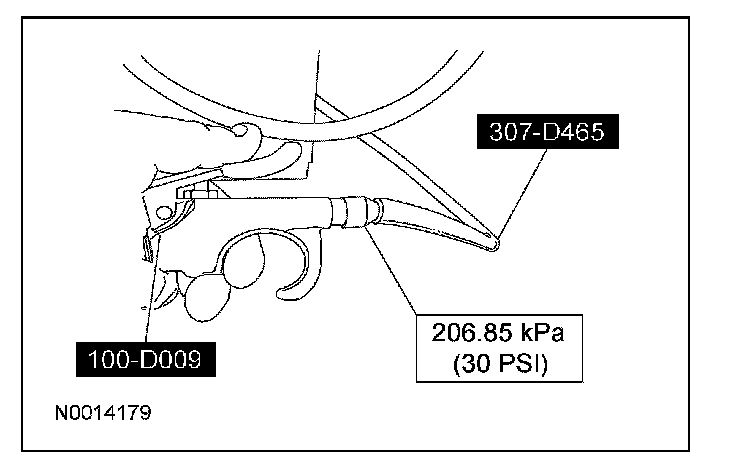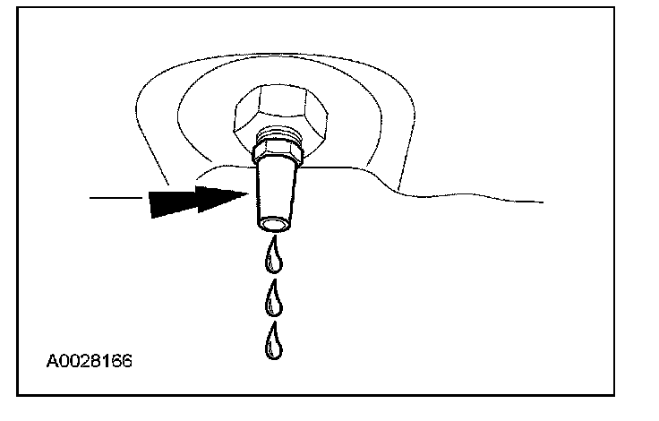 7. Apply a maximum of 206.85 kPa (30 psi) to the open end of the vacuum/pressure hose from the special tool. Transmission fluid will immediately start flowing out of the special tool into the transmission fluid pan.
