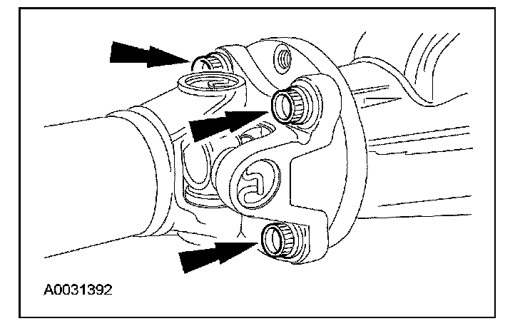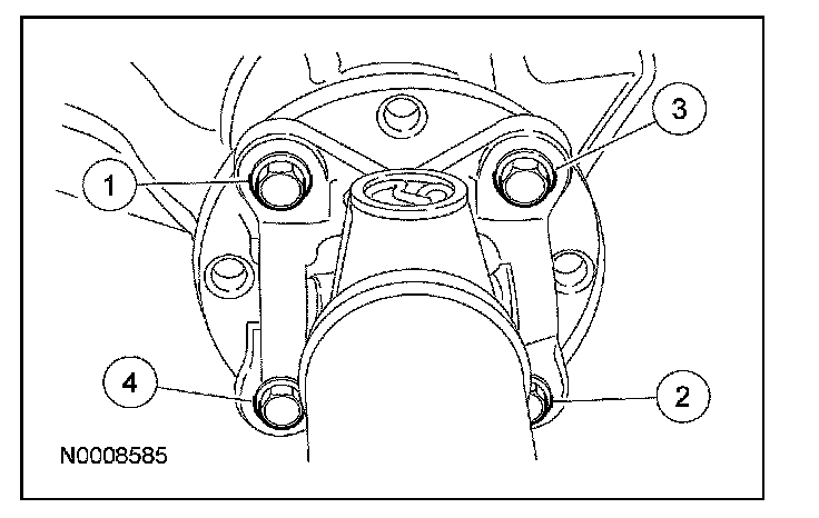 11. CAUTION: The driveshaft centering socket yoke fits tightly on the pinion flange pilot. To make sure that the yoke seats squarely on the pinion flange, tighten the driveshaft flange bolts evenly in a cross-pattern as shown.