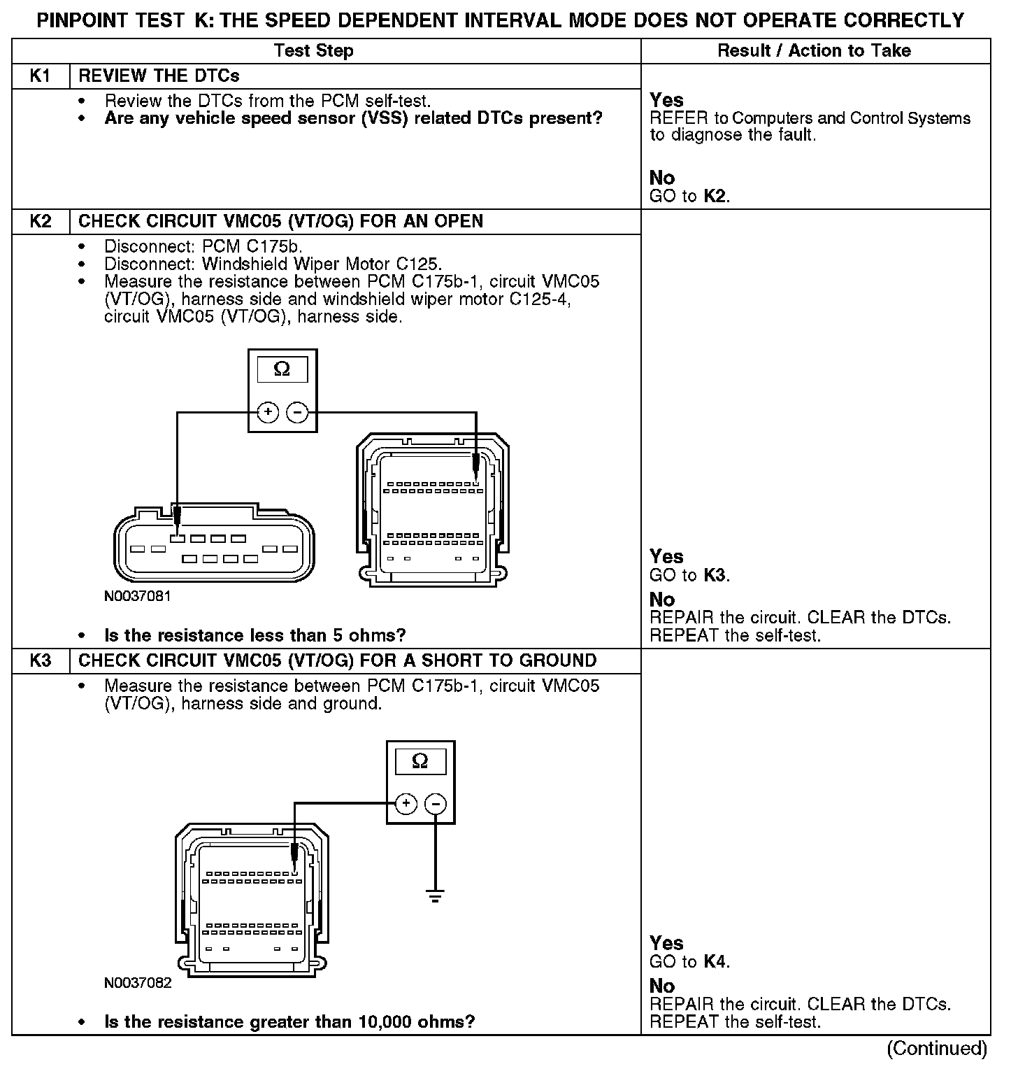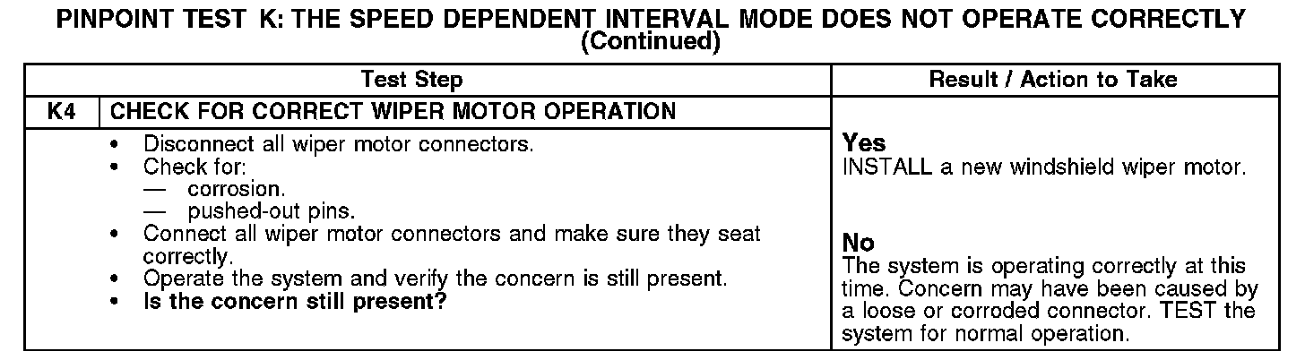 Under normal operation, the windshield wiper motor receives vehicle speed information from the PCM through circuit VMC05 (VT/OG). The speed dependent wipers function in all INT modes except INT 1.