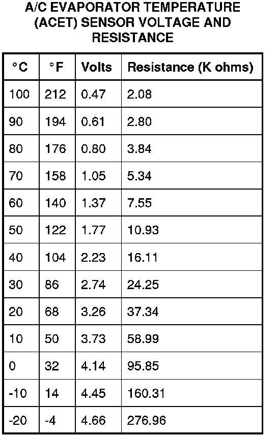 A/C Evaporator Temperature (ACET) Sensor Voltage And Resistance Chart: