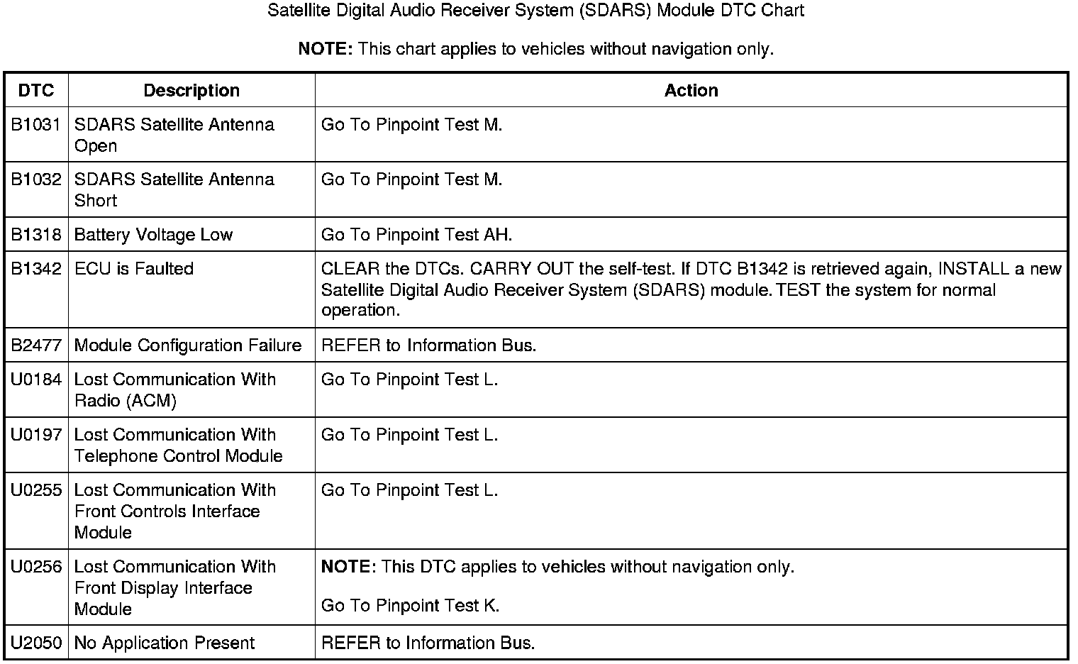 Satellite Digital Audio Receiver System (SDARS) Module DTC Chart