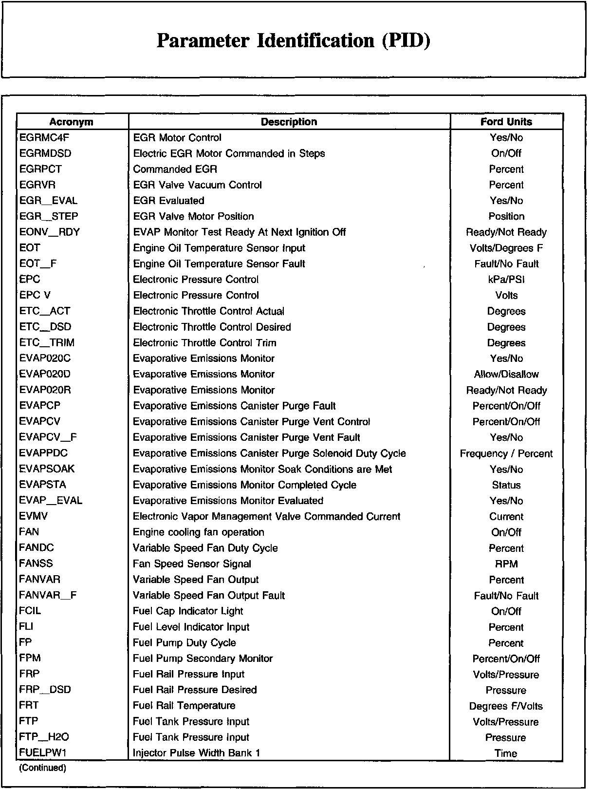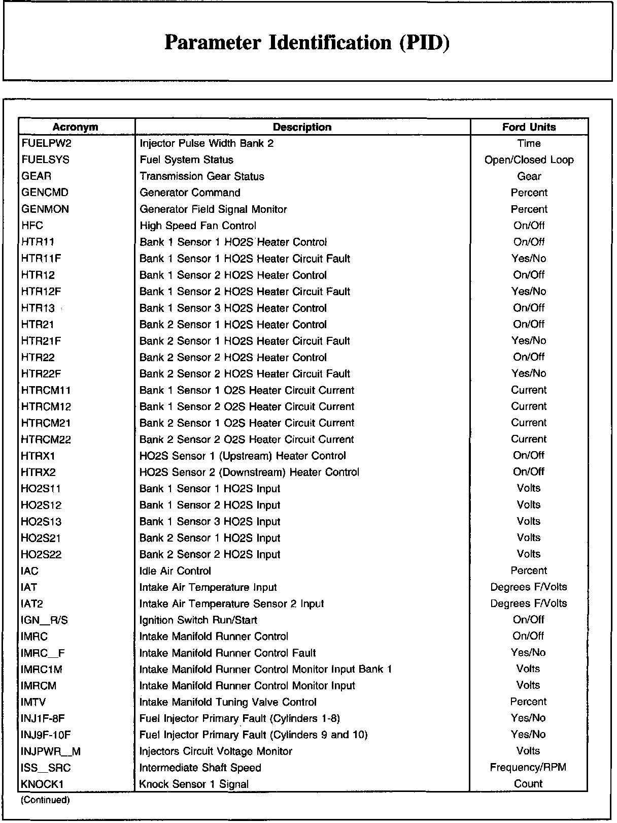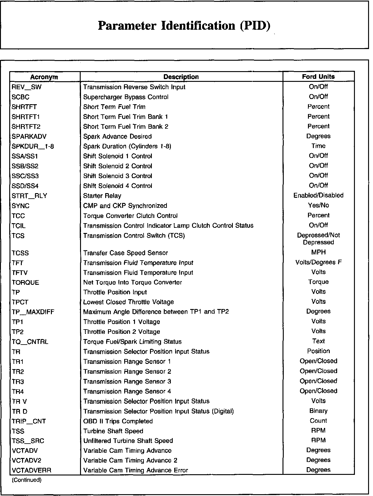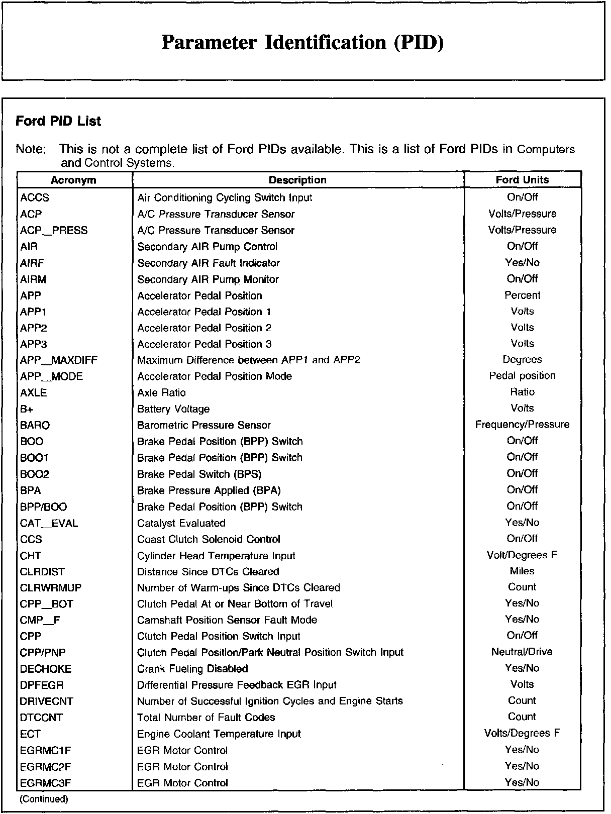 Ford PID List (Part 1):
