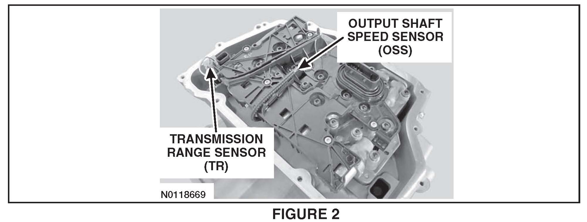 7. Disconnect the Output Shaft Speed (OSS) sensor and the Transmission Range (TR) sensor electrical connectors. See Figure 2.