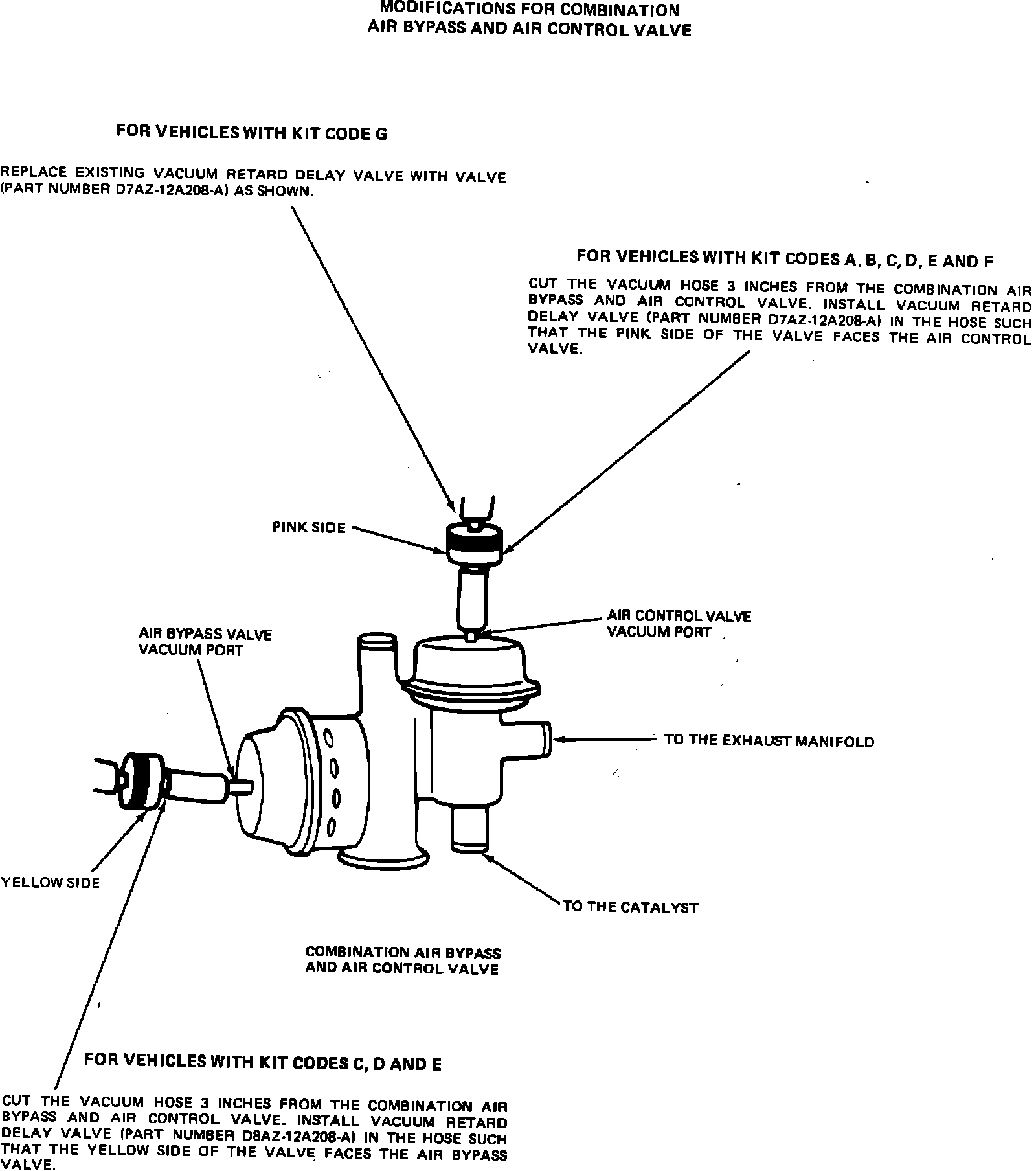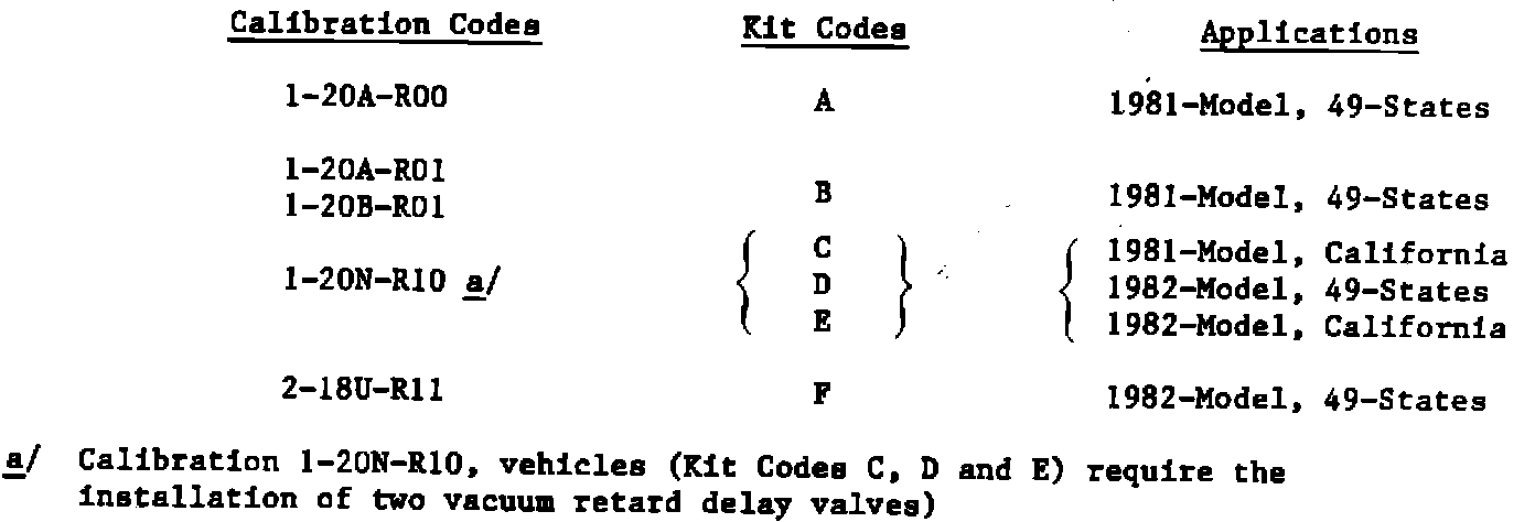 This procedure applies to vehicles having the following engine calibrations/kit codes and involves the installation of vacuum retard delay valves (VRDV) in the air control and/or air bypass valve vacuum hose.