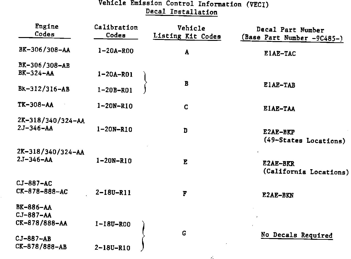 NOTE: A Replacement Vehicle Emission Control Information (VECI) decal is not required for vehicles with Kit Code G.