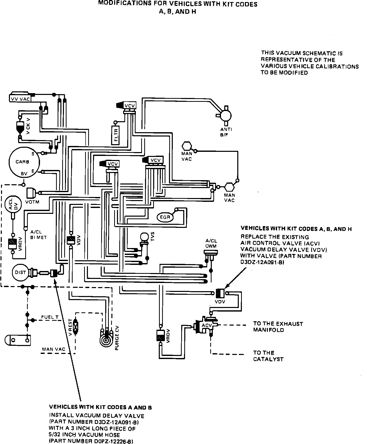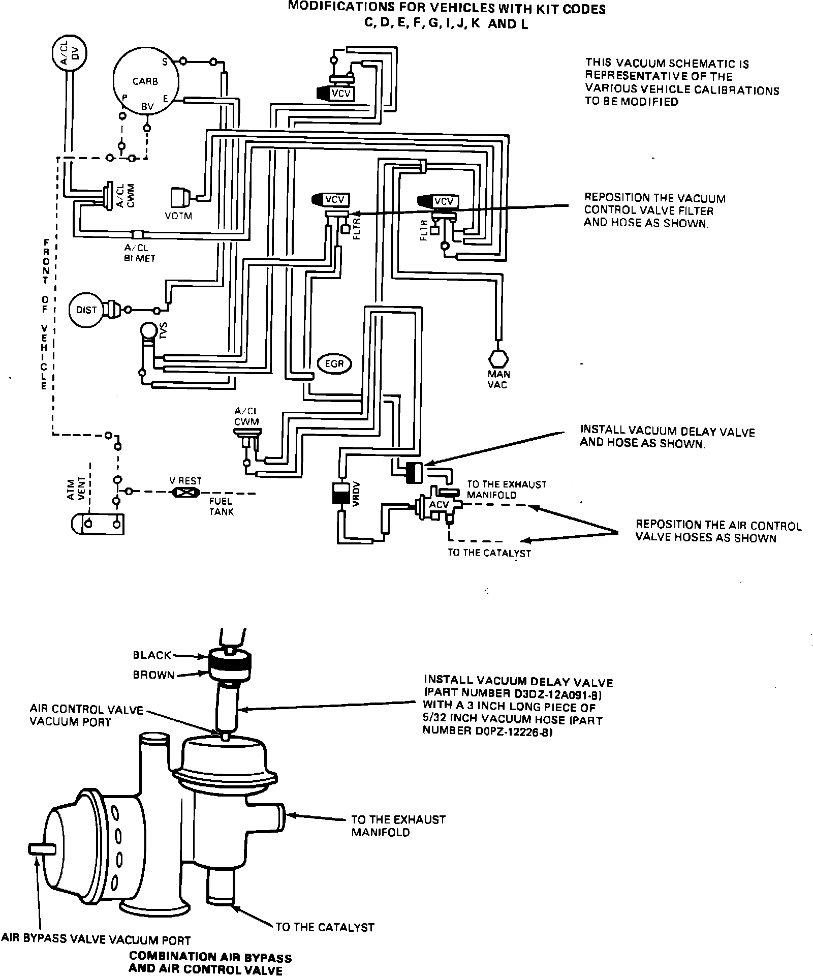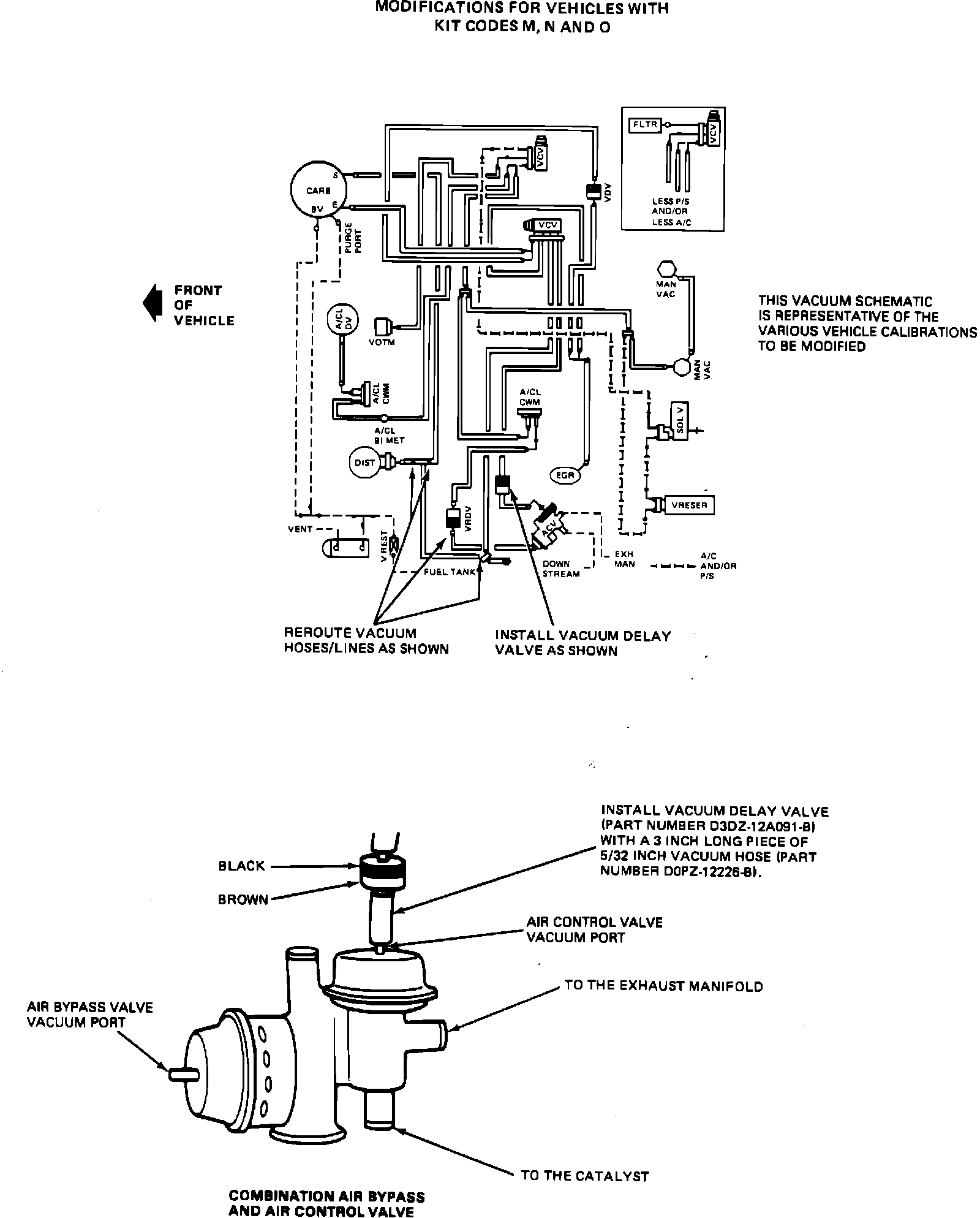 1. Refer to Exhibit III. Remove the air control valve (ACV) vacuum hose located at the combination air bypass and air control valve port without the holes and filter. Install a black/brown vacuum delay valve (VDV) (part number D3DZ-12A091-B) with a 3-inch piece of 5/32-inch vacuum hose (part number D0PZ-12226-B). Install the valve and the 3-inch piece of hose such that the black side of the valve is facing the vacuum source.