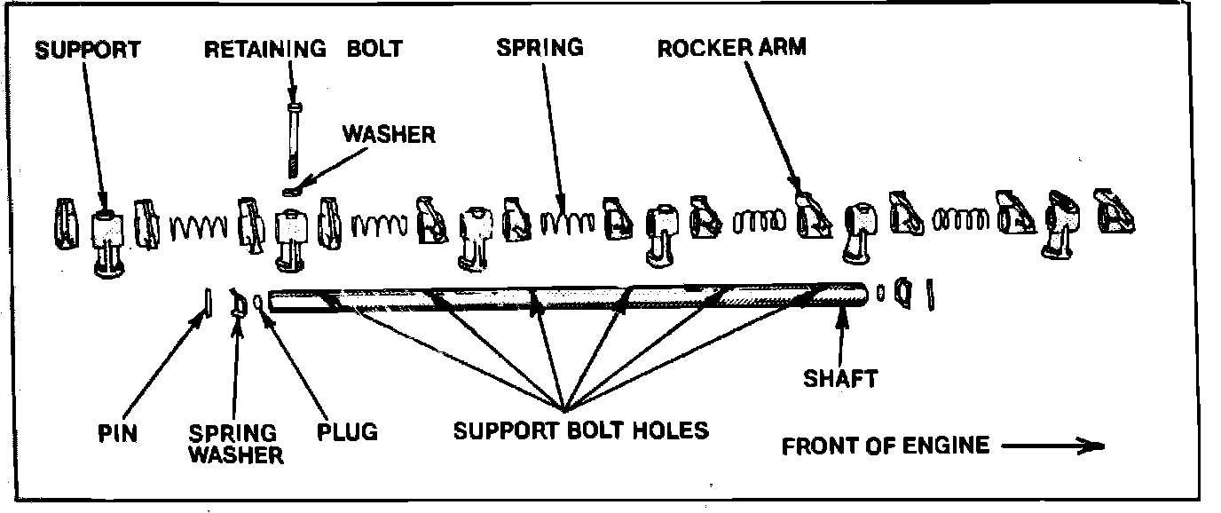 2. Slide rocker arms, springs and supports off the shaft, being sure to identify location of parts for reassembly.