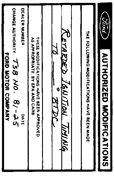 Prepare an Authorized Modifications decal (FPS-8262) and list the date of service, dealer number and modifications performed as shown. Select a prominent place adjacent to the Vehicle Emission Control Information decal suitable for installing the Authorized Modifications decal. Clean the area, install the decal and cover it with a clear plastic decal shield.
