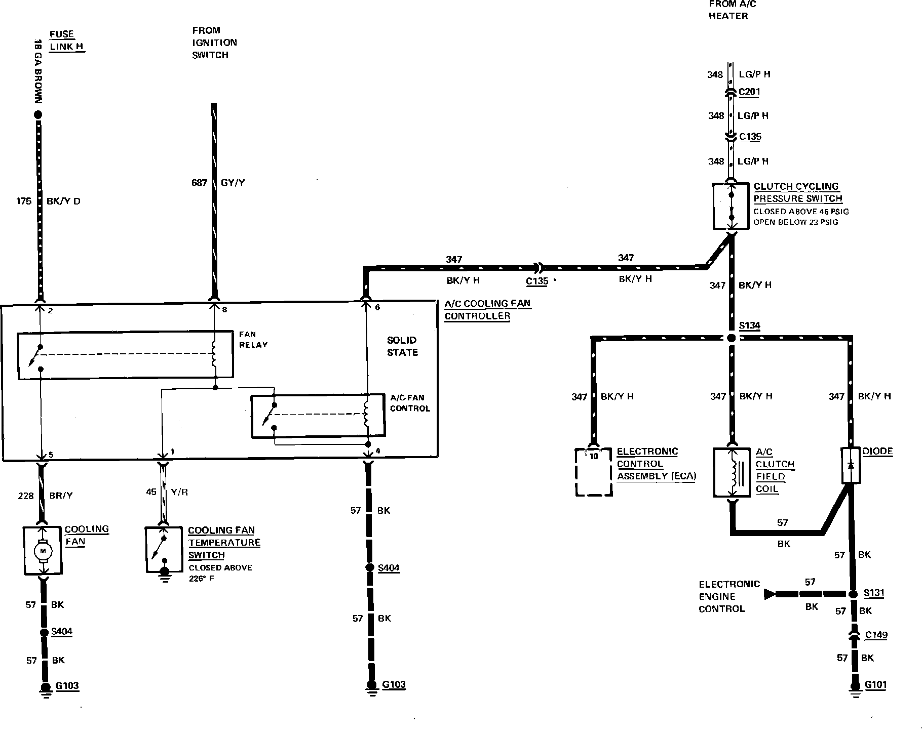 Fig. 7 Air conditioning compressor clutch & cooling fan wiring circuit. 1983 Capri & Mustang with 4 cyl engine with turbocharger:
