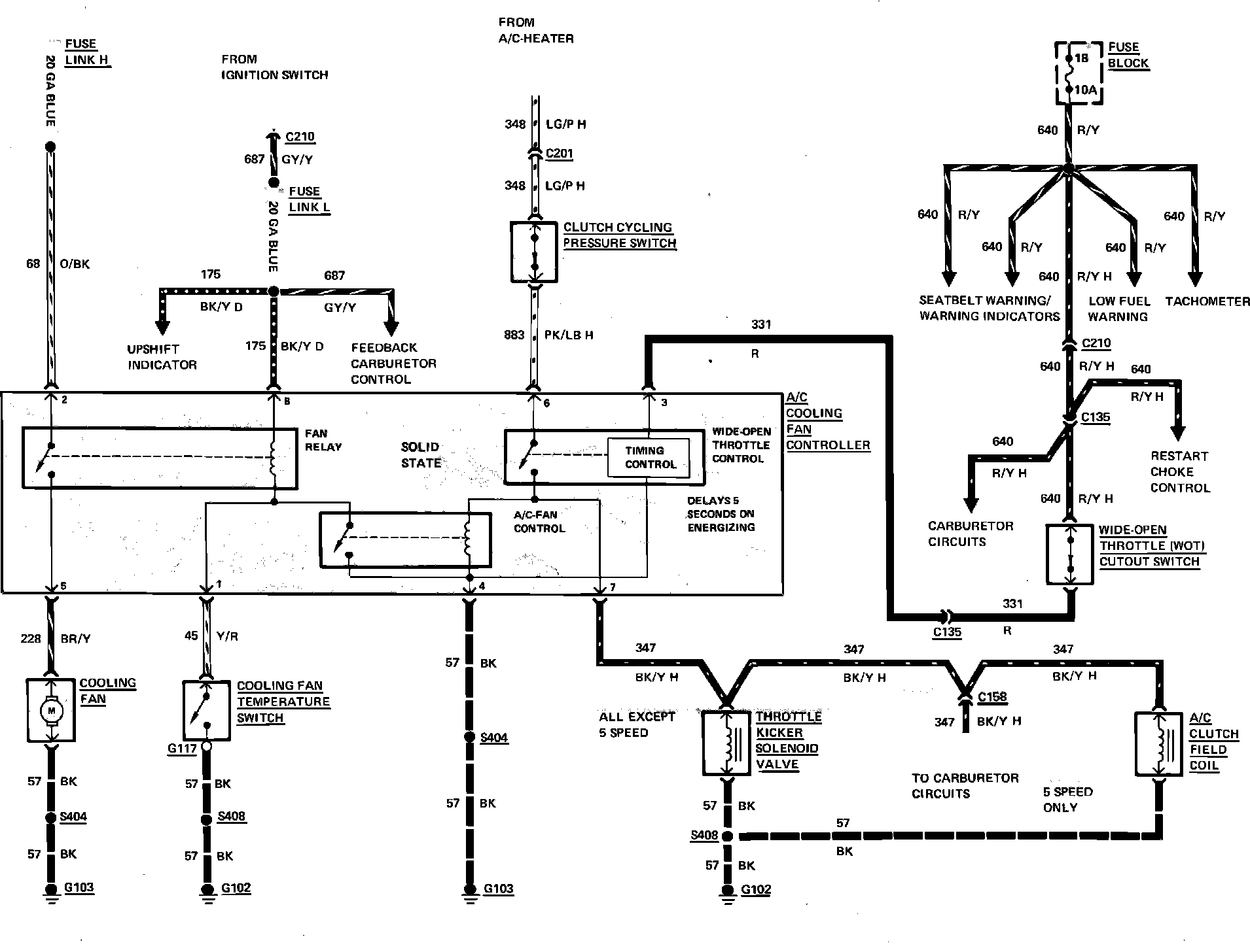 Fig. 6 Air conditioning compressor clutch & cooling fan wiring circuit. 1983 Capri & Mustang with 4 cyl engine less turbocharger: