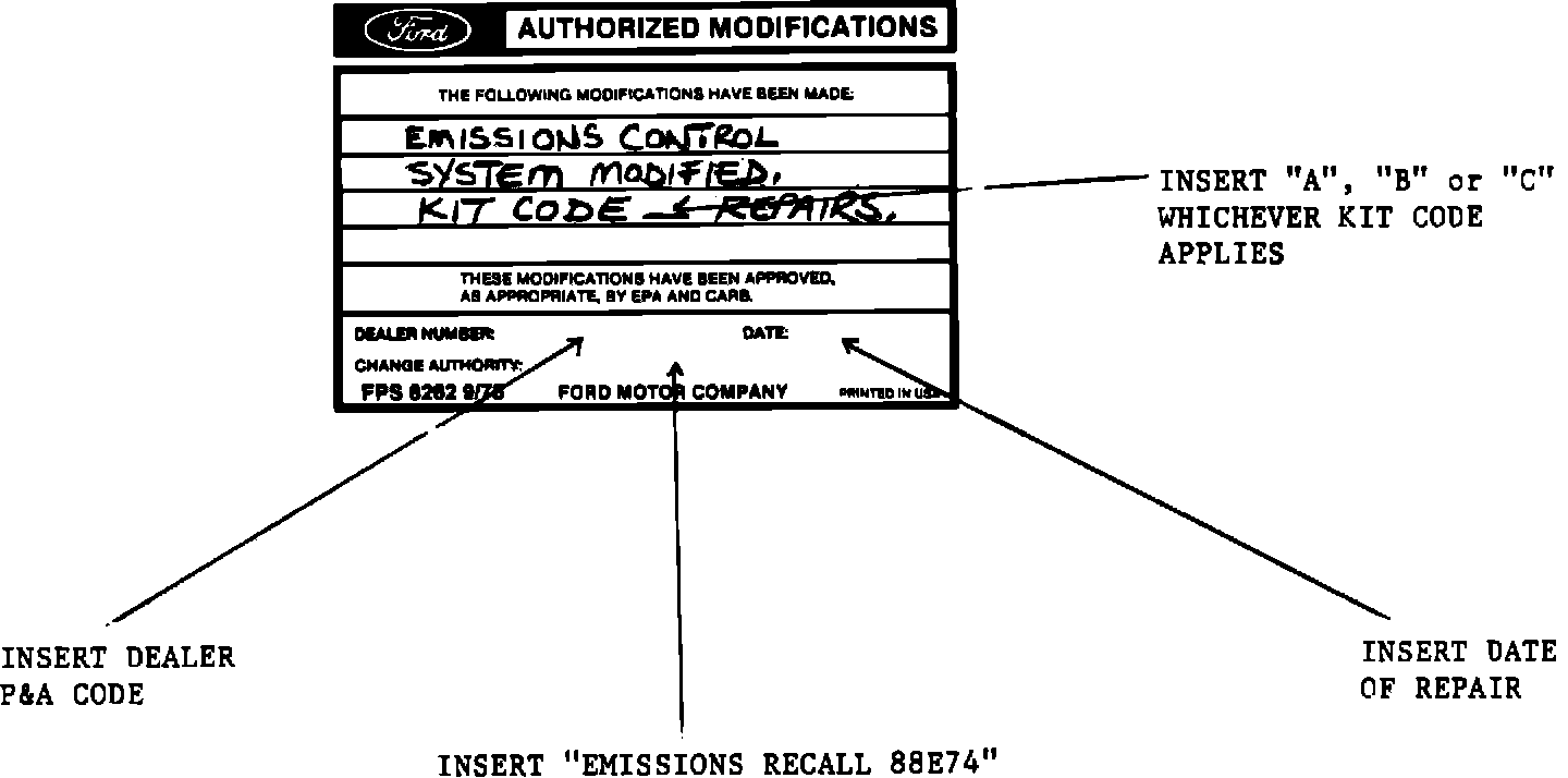 PREPARE THE DECAL AS SHOWN. AFFIX THE DECAL TO A FLAT, CLEAN SURFACE ON THE RADIATOR SUPPORT. ORDER THE DECALS ON YOUR WEEKLY STOCK ORDER PAD. (AUTHORIZED MODIFICATIONS DECAL, FORM FPS-8262).