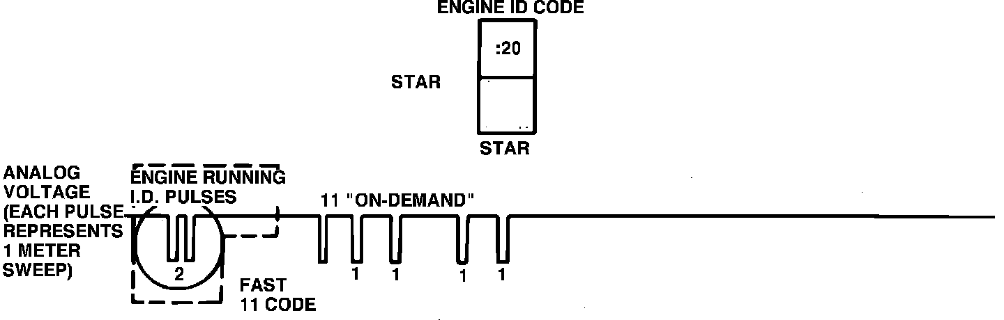 Engine identification codes are issued at the beginning of the engine running test and are one digit numbers represented by the number of pulses transmitted. The engine identification code is equal to the number of engine cylinders when the number is multiplied by two and the zero dropped. These codes are used to verify that the proper processor is installed and that the self-test has been entered, Fig. 30.