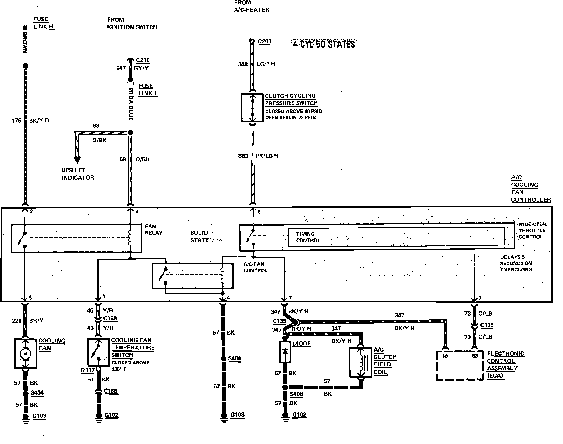 Fig. 10 Air conditioning compressor clutch & cooling fan wiring circuit. 1984 Capri & Mustang with 4 cyl engine less turbocharger: