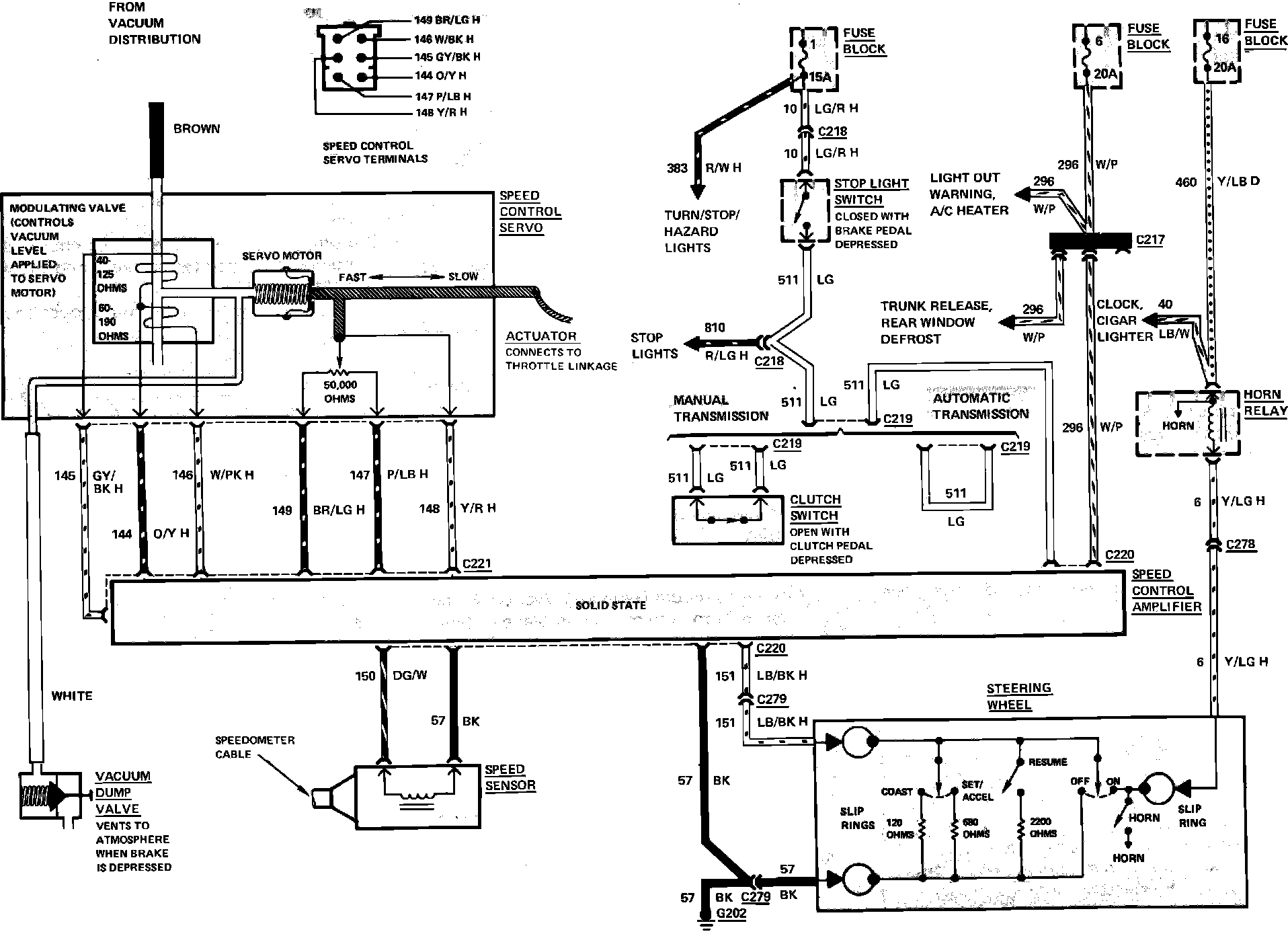 Fig. 1 Speed control wiring schematic (typical). 1982---83 Fairmont & Zephyr, 1982---87 Mustang & Capri; 1982 Granada; 1982---83 Cougar; 1983---86 LTD & Marquis: