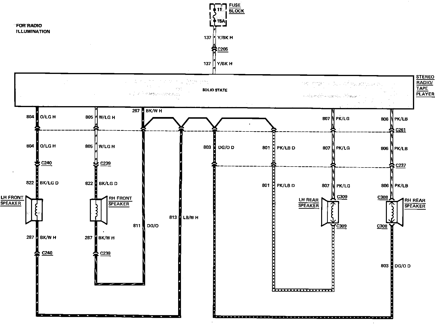 Fig. 63 Radio & speaker wiring circuit. 1984 Capri & Mustang with stereo radio less premium sound: