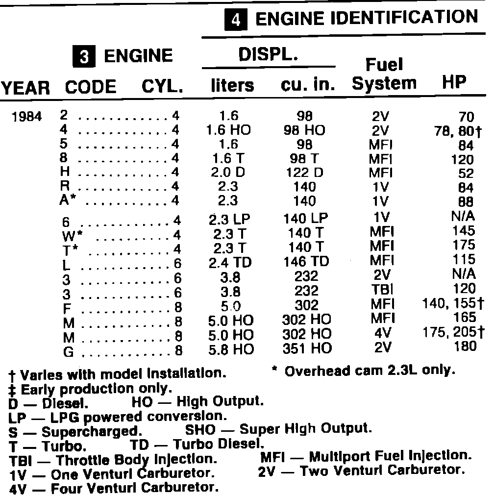 (4) ENGINE IDENTIFICATION: On the line where the engine code appears, read to the right to identify the engine.