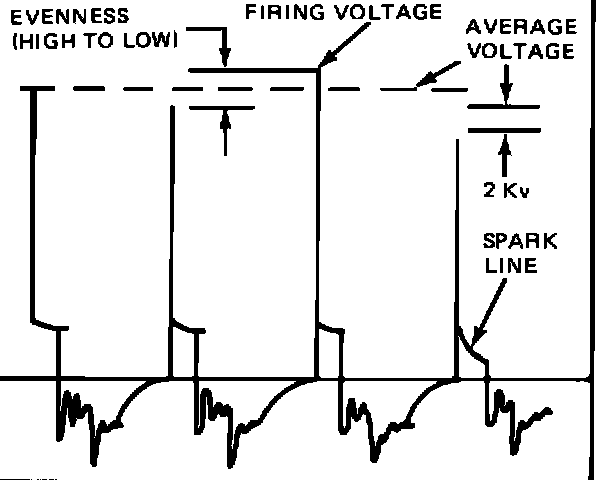 To identify a shorted or fouled plug or wire, examine both the firing voltage and the spark line. If the firing voltage for a particular cylinder is consistently more than 2Kv below the other cylinders or the spark line slopes down more than the others, check the plug and wire for that cylinder and service as required.
