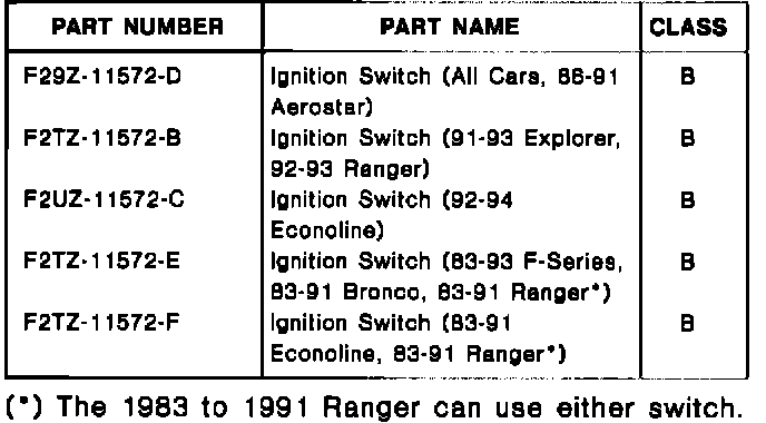 If the vehicle displays the subject symptoms and meets the following conditions, replace the ignition switch. Refer to the appropriate Car or Light Truck Service Manual (Section 13-04 for 1983-1990 Cars, Section 11-04 for 1991-1993 Cars and Section 13-05 for 1983-1990 Light Trucks, Section 11-05 for 1991-1993 Light Trucks) for removal and installation procedures. Refer to the Parts Block in this article for correct parts usage.