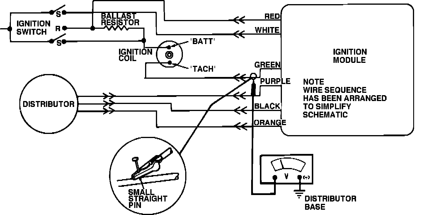 1. With ignition ``Off,'' install a straight pin into module green wire, Fig. 8. Connect a suitable voltmeter positive lead to straight pin and ground negative lead to distributor base. Turn ignition ``Run'' and measure voltage. Do not allow straight pin to contact engine ground.