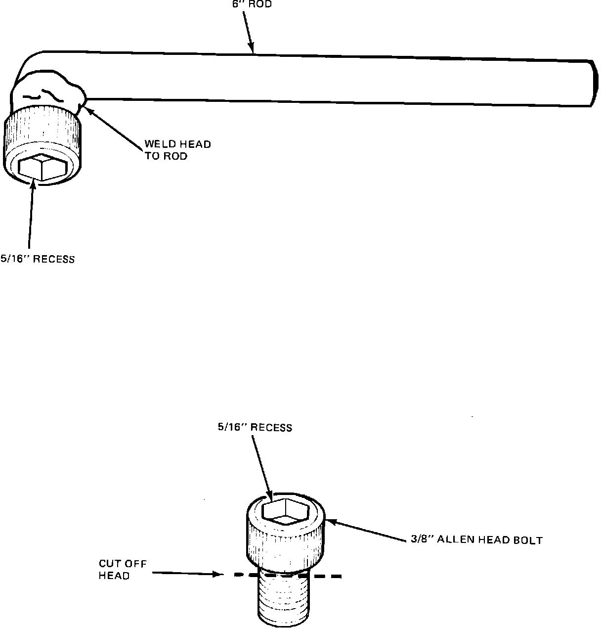 Cut the Allen head from the bolt and weld the head to the 6" rod. The rod will serve as a handle (Figure 12). In addition, the recess in the Allen head fits the 5/16-inch head in the differential pinion shaft lock bolt precisely.