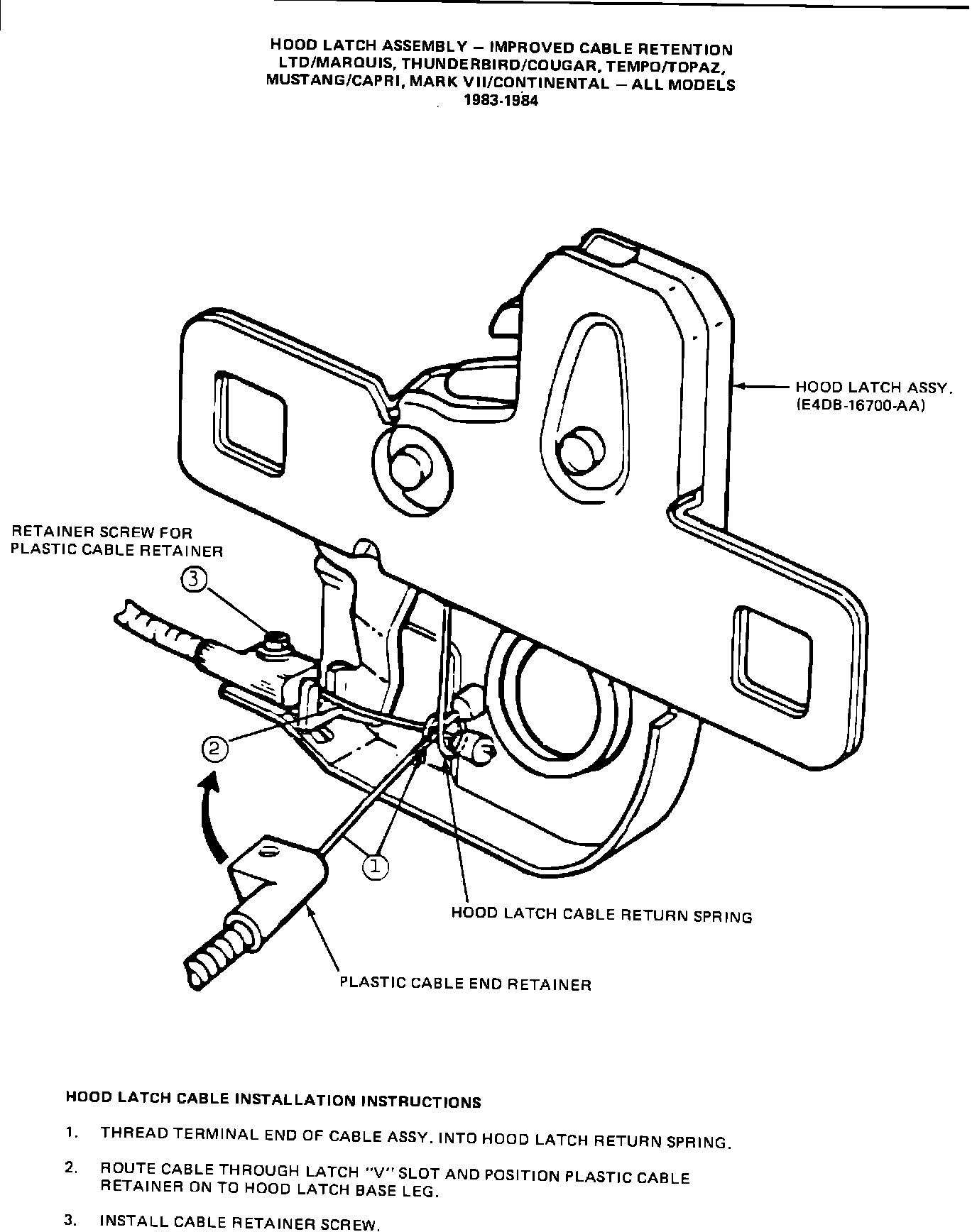 A new design hood latch is now available, with improved cable retention provisions. The new design hood latch assembly is to be installed when customer concerns related to hood latch cable retention on subject car lines is encountered. This article supersedes and cancels TSB Article 83-7-2, dated April 5, 1983. The new design incorporates a cable return spring.