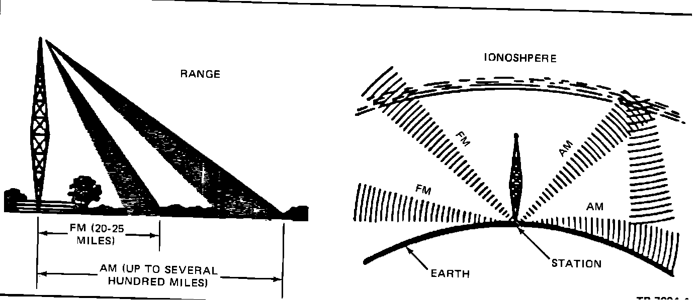 ^ FM range is limited to 20-25 miles, except for high power stations. Monaural FM stations have greater range than stereo FM. Range for FM does not depend on time of day. As the station signal gets weaker, volume stays about the same, but noise increases. FM signals follow a "line-of-sight" path and are not reflected by the ionosphere (Figure 20).