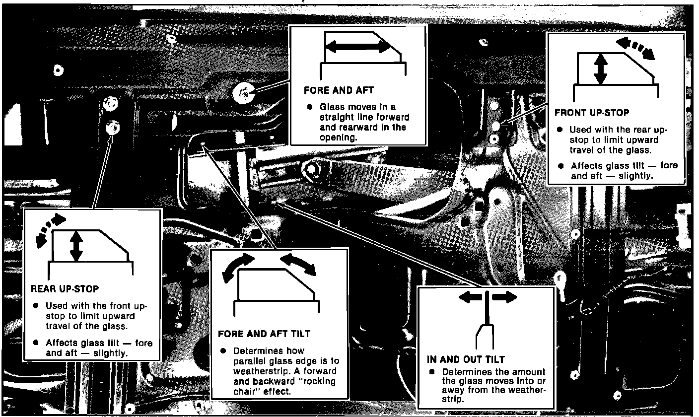 We're Going To Help . . . We're going to begin the adjustment procedure by showing you where the door glass adjustments are and how each one changes the fit of the glass.