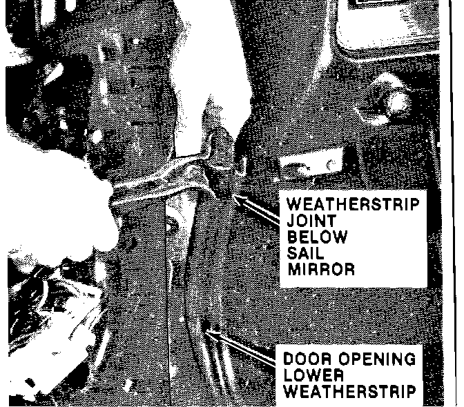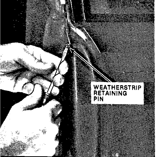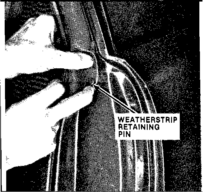 NOTE: Check the mating of the door weatherstrip to the "B" pillar weatherstrip for fit to be sure a good seal is made and the weatherstrip on the "B" pillar is not collapsed at the molded end. If necessary, redrill the pin hole to get the proper fit.