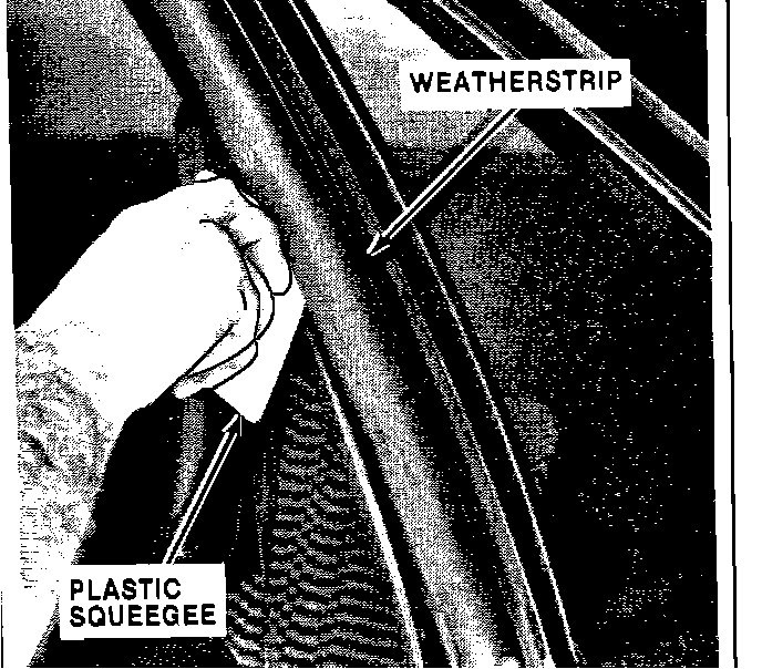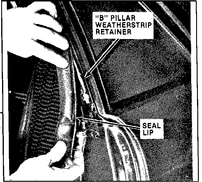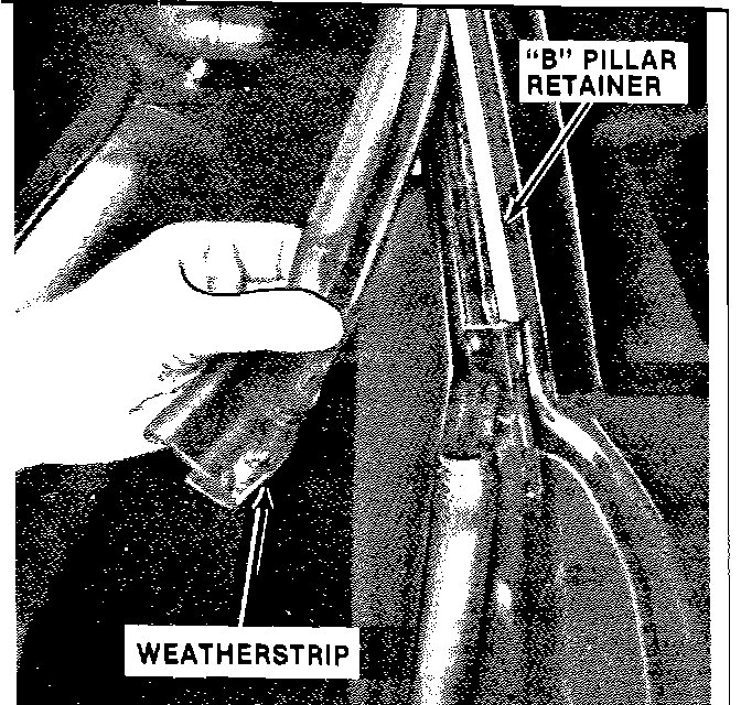 15. Seat the weatherstrip in the "B" pillar retainer using a plastic squeegee or similar tool.