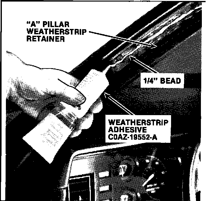 10. Apply a 1/4 inch bead of Weatherstrip Adhesive, COAZ-19552-A (or equivalent), along the center of the "A" pillar weatherstrip retainer.