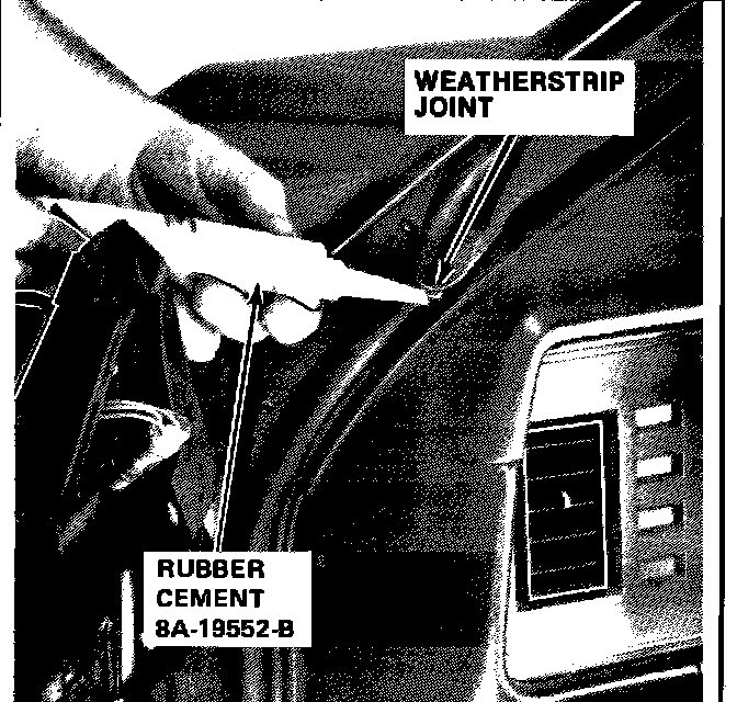 12. Glue upper weatherstrip to lower weatherstrip using rubber cement (8A-19552-B).