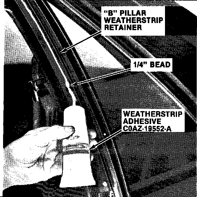 13. Apply a 1/4 inch bead of Weatherstrip Adhesive, COAZ-19552-A (or equivalent), along the center of the "B" pillar weatherstrip retainer.