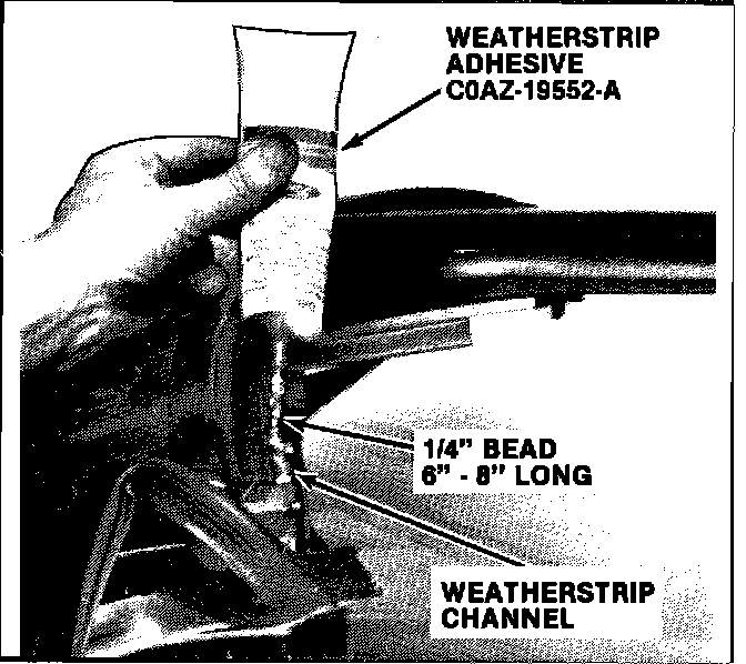 17. Apply a 1/4 inch bead of Weatherstrip Adhesive, COAZ-19552-A (or equivalent), in the hatch weatherstrip channel at the "A" and "B" pillars. The head should begin at the hatch striker and extend into the channel for 6-8 inches.