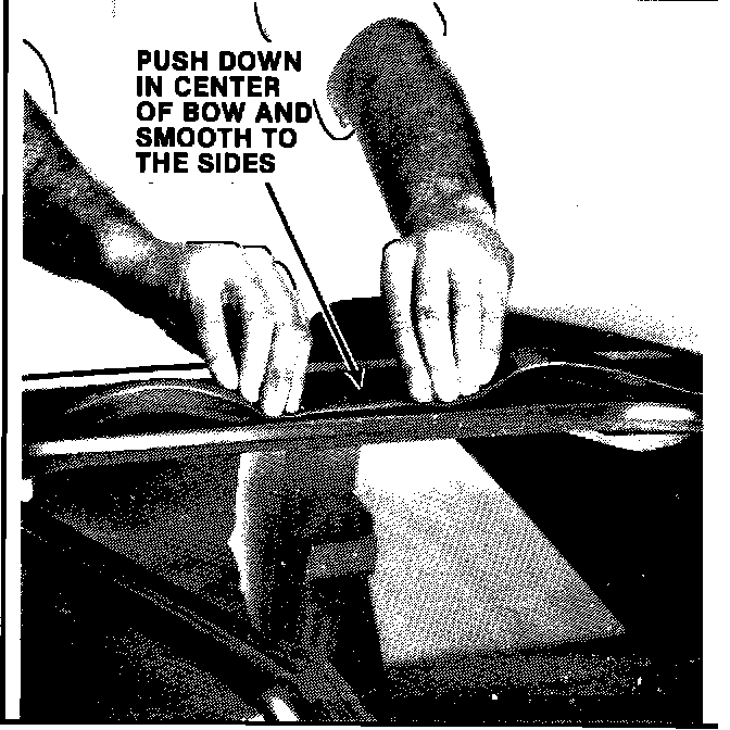 19. To remove the "bow" at the T-bar, push the center into the weatherstrip and fit it smoothly to either side.