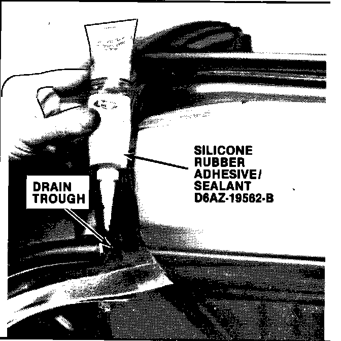 20. In the drain trough, apply a 1/4 inch bead of Silicone Adhesive/Sealant, D6AZ-19562-A (or equivalent), under the weatherstrip tab and smooth the adhesive out being careful not to block up the drain trough.