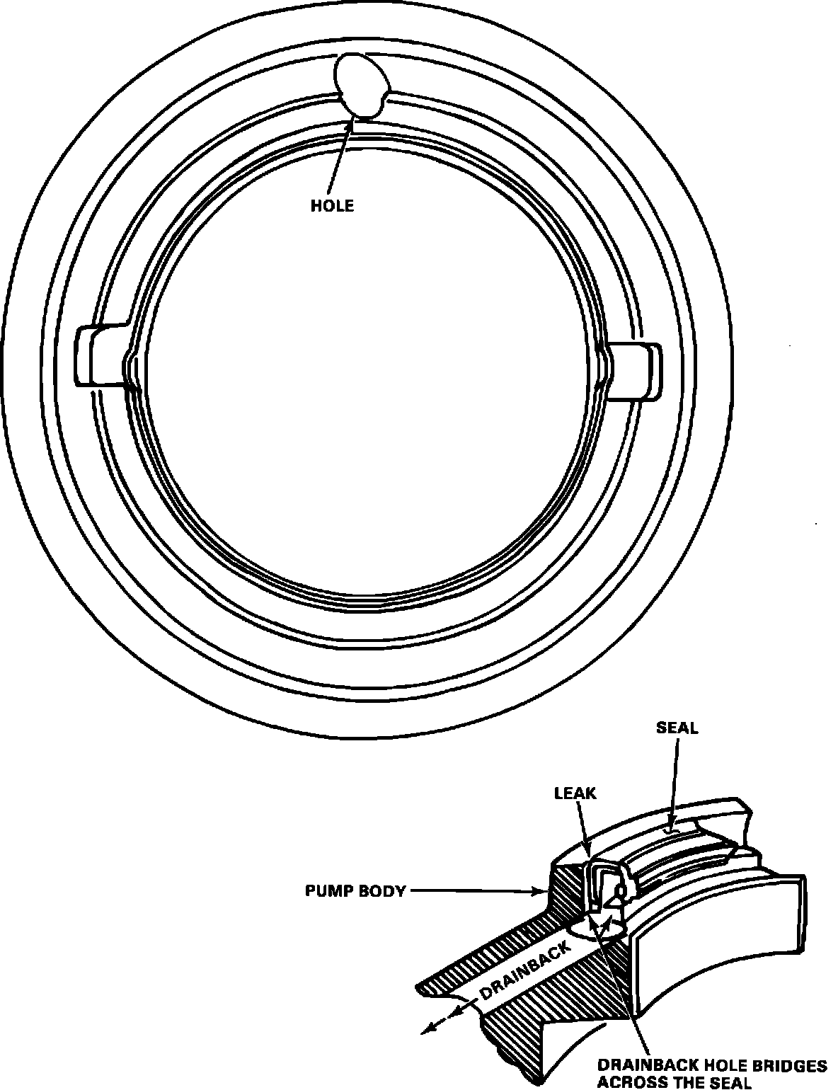 2. Check the relationship of the drainback hole at the pump body to the sealing face of the seal (Figure 12). If the hole bridges the seal metal face, thoroughly clean and dry the pump body seal mating surface with spot remover (B7A-19521-A).