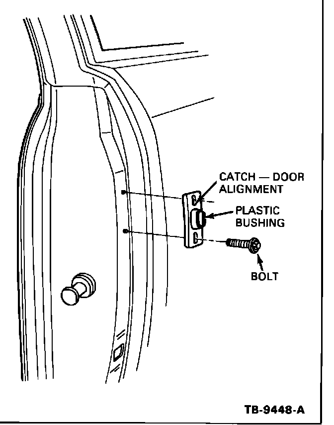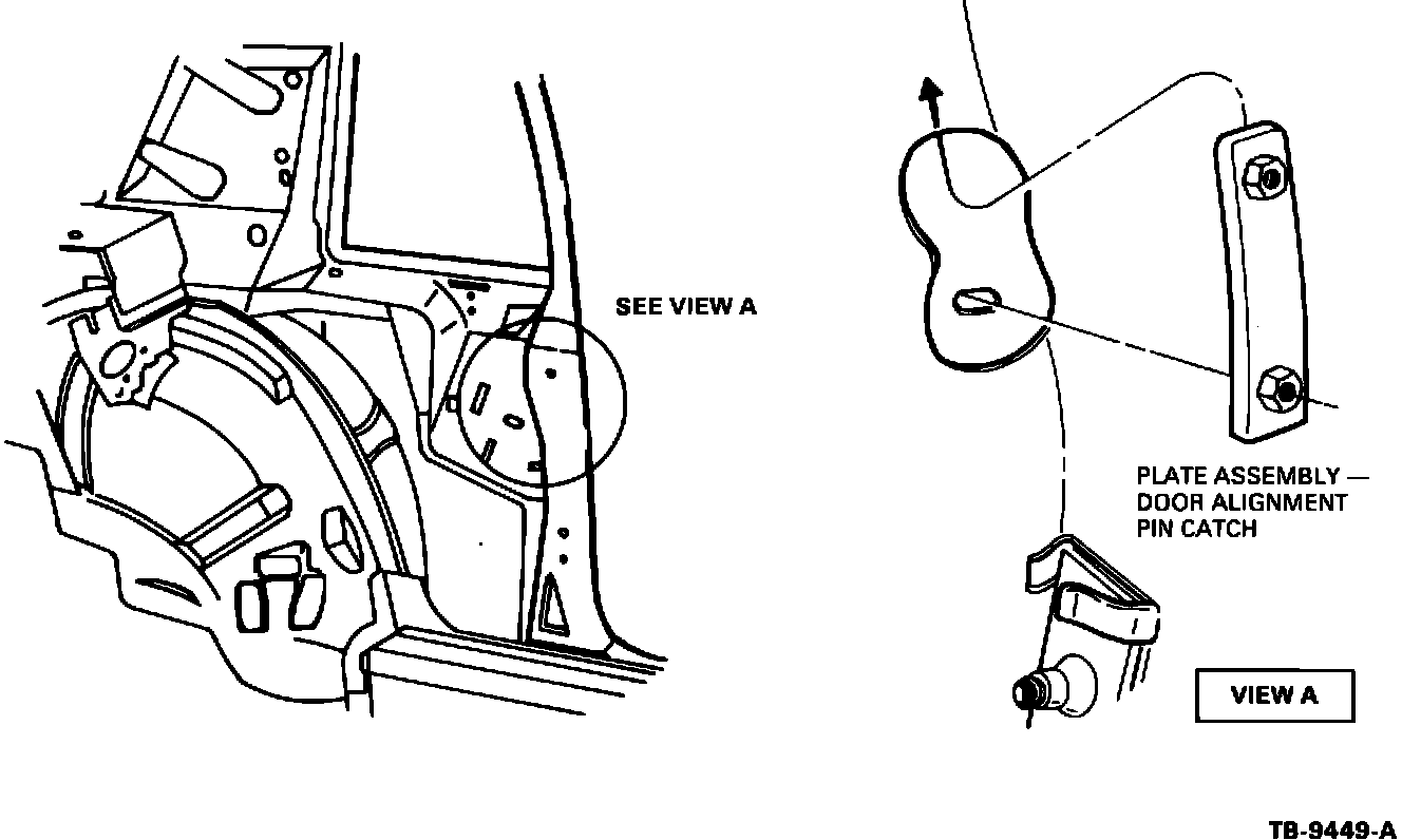8. Install door alignment pin catch and door alignment pin catch plate on each door "B" pillar with bolts provided, Figures 3 and 4.