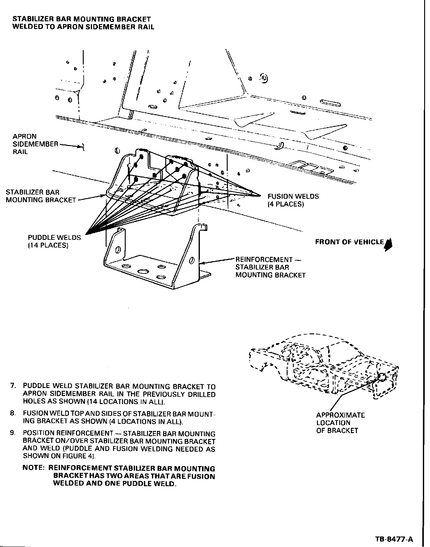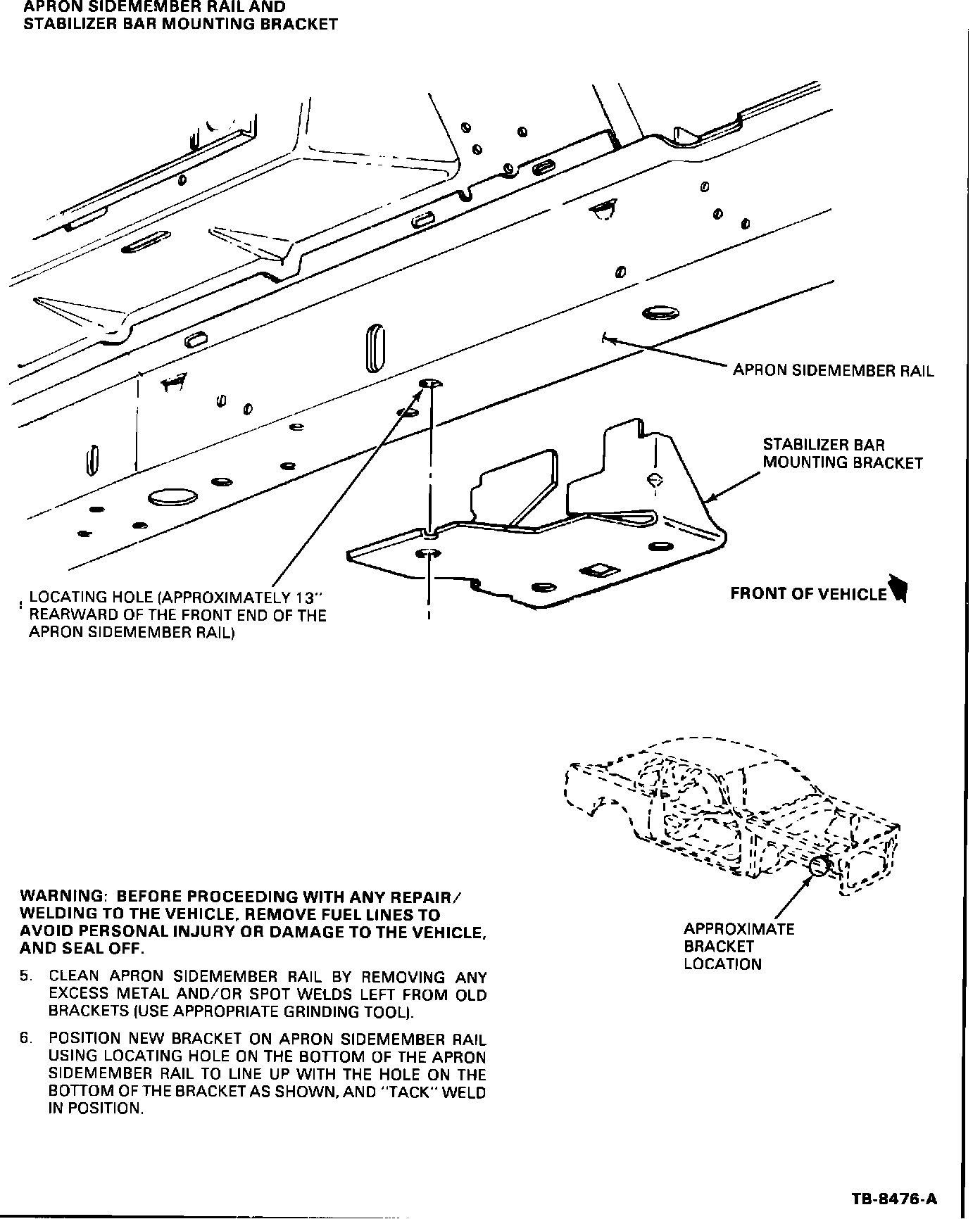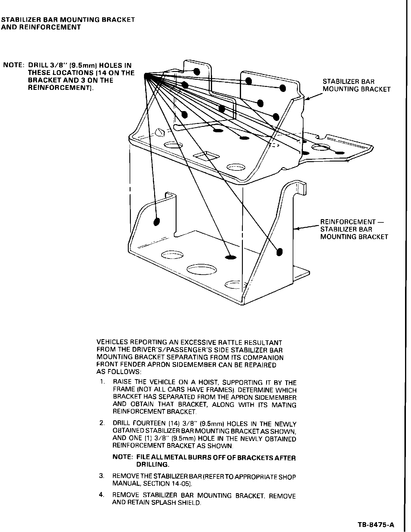 A rattle, heard in the front end suspension area, may be caused by a separation of the stabilizer bar mounting bracket from the front fender apron sidemember. Attached are detailed instructions and illustrations of specific locations and brackets and recommended repair procedures. See Figures 1, 2, 3 and 4.